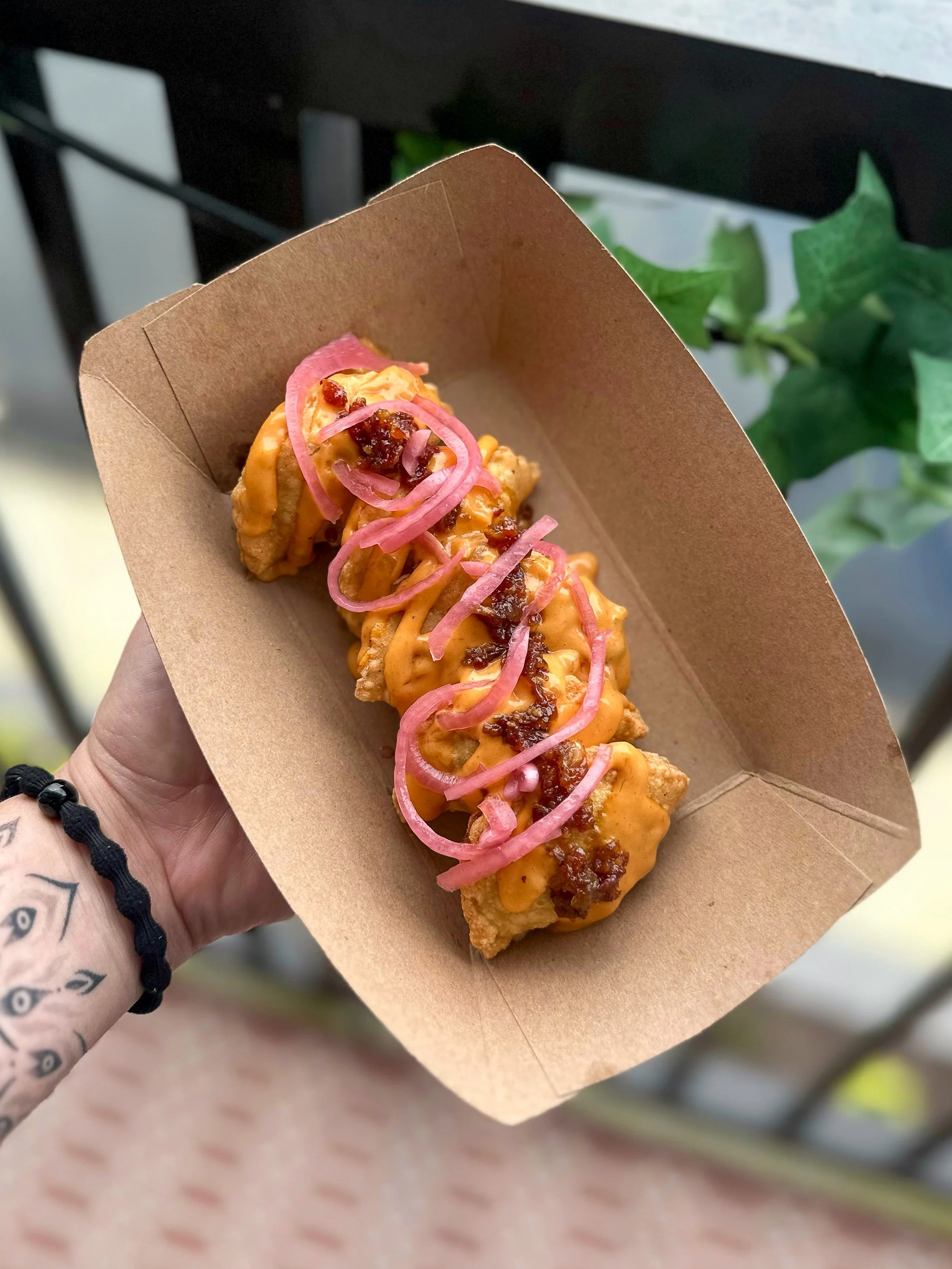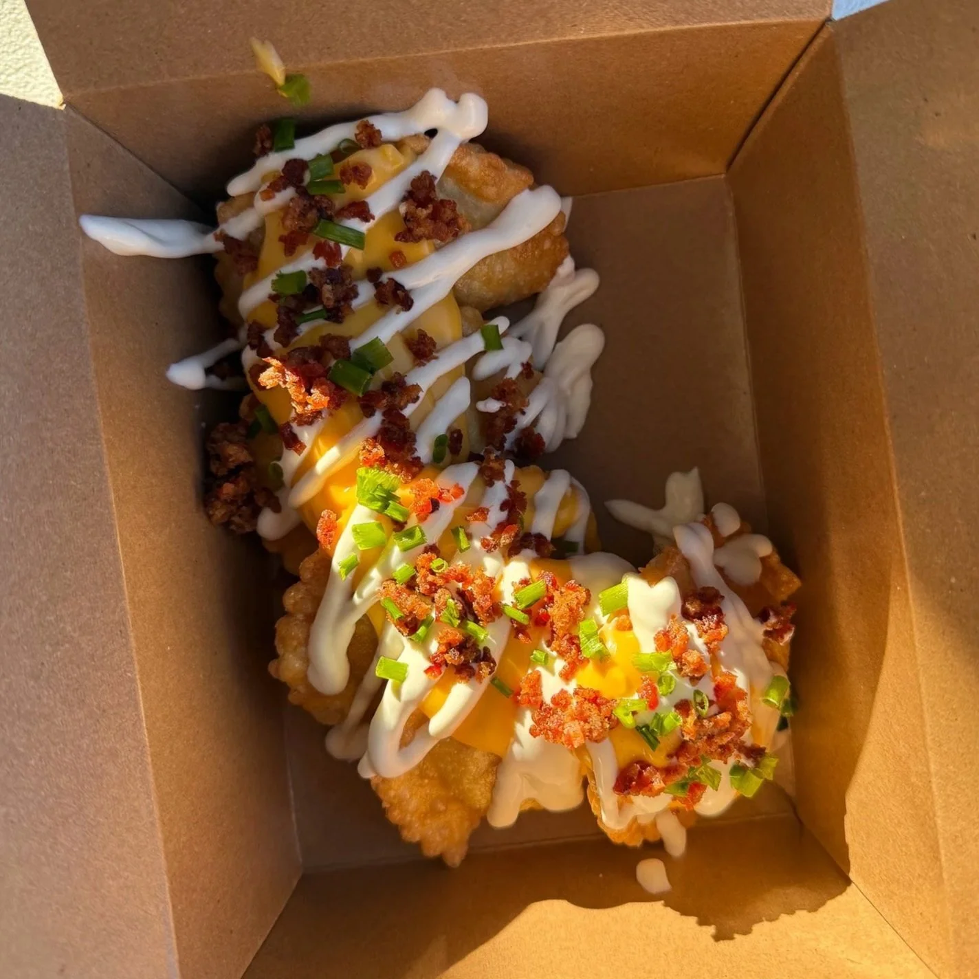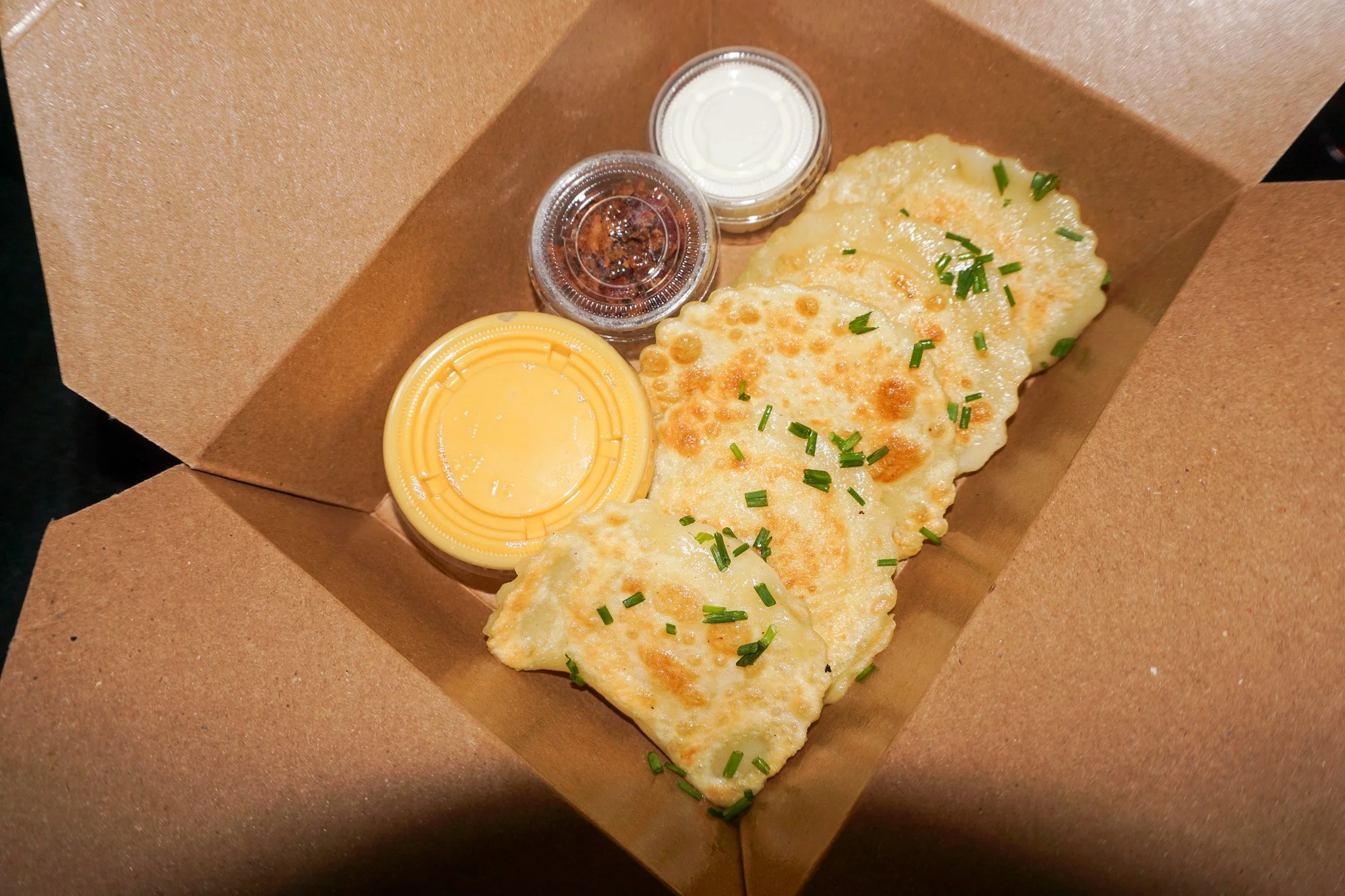 Creamy potato filling with cheddar, crispy bacon, chives, and a hint of sour cream. The Classic in a party outfit.